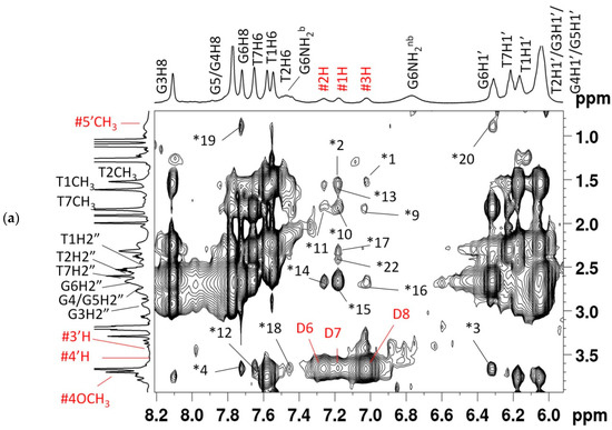 The quadruplex [d-(TTGGGGT)]4 was titrated with daunomycin at D/N = 0.0–4.0 and monitored by 1H and 31P NMR at several D/N ratios at three different temperatures: 25 °C, 30 °C, and 40 °C. Two-dimensional 1H-1H NOESY, 1H-13C HSQC, and 1H-31P HMBC spectra were recorded at D/N = 1.0, 2.0, 3.0, and 4.0 at 25 °C. 1H-1H NOESY and 1H-13C HSQC spectra were also recorded at 35 °C at D/N = 1.0, 2.0, and 3.0. The progressive addition of daunomycin to 1.16 mM of [d-(TTGGGGT)]4 resulted (Figure 3a,b) in the shifting and broadening of DNA proton signals along with the appearance of new signals, which were subsequently assigned to daunomycin protons. A single set of sharp, well-defined and intense resonances of GNH, GH8, TH6, and TCH3 protons shows that there is no loss of fourfold symmetry of [d-(TTGGGGT)]4 upon complexation. The unambiguous assignment of all non-exchangeable and exchangeable protons of [d-(TTGGGGT)]4, as well as daunomycin protons in complex at D/N = 1.0–4.0, was accomplished (Table 1, Table 2, Table S1a–c and Table S2a–d) by an analysis of proton NMR spectra of free [d-(TTGGGGT)]4 (Figure S1a,b), free daunomycin (Figure S2), the daunomycin-[d-(TTGGGGT)]4 complex (Figure S3a,b), their corresponding 1H-1H NOESY (Figure S1c–f or Figure S3c–f), and the 1H-13C HSQC (Figure S4a–d) spectra. The resonance signals of deoxyribose protons of DNA could be clearly distinguished from the daunosamine sugar and ring A/D protons signals in 1H-13C HSQC spectra (Figure S4a–d), in spite of spectral overlap. The 1H and 3H of daunomycin (7.0–7.3 ppm) show clear distance correlation with 4OCH3 resonance (3.67 ppm). The carbons attached to them resonate at ~119 ppm (Figure S4a), which is far apart from the 13C signals of the bases (133–139 ppm) and deoxyribose H1′ (82–92 ppm) (Figure S4c). The 13C signals (63–67 ppm) of deoxyribose H5′/5′′ (3.7–4.4 ppm) separate out from those of 4OCH3, 7H, 5′H, 4′H, and 3′H protons (Figure S4b). Similarly, 2axH, 2eqH, 10axH, 10eqH, 8axH, 8eqH, and 9COCH3 resonances (1.7–2.8 ppm) that overlap with deoxyribose H2′/H2′′ (2.2–3.0 ppm) have 13C signals close to that for free drugs in the range 22–35 ppm (Figure S4d), which are well separated from the corresponding 13C signals of H2′/H2′′ (36–44 ppm). The existence of a single set of resonances for both ligand and DNA show that a well-defined stable complex is formed, which refers to the major conformer present in the ligand–DNA complex.