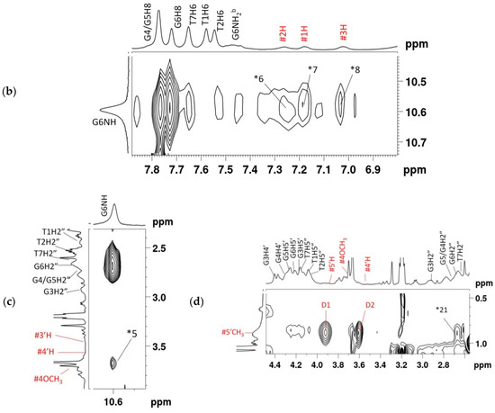 2D 1H-1H Nuclear Overhauser Enhancement SpectroscopY (NOESY) spectra of daunomycin-[d-(TTGGGGT)]4 complex at D/N = 2.0, mixing time τm = 250 ms, at 25 °C. Expansion of specific regions of NOESY spectra showing NOE (Nuclear Overhauser Enhancement) correlations between (a) daunomycin protons 1H, 2H, 3H, 5′CH3, 3′H, 4′H, and 4OCH3, and H8/H6/H1′/H2′/H2′′/CH3 protons along with intramolecular NOE cross-peaks of daunomycin (D); (b) Daunomycin protons 1H, 2H, 3H, and imino proton, (c) daunomycin proton 4OCH3 and imino proton; and (d) Daunomycin proton 5′CH3 and sugar H2′′ proton along with intramolecular NOE cross-peaks of daunomycin (D). Symbol # denotes daunomycin protons, D denotes intramolecular cross-peaks of daunomycin (D numbering as in Table S3), and * denotes intermolecular cross-peaks between daunomycin and DNA [d-(TTGGGGT)]4 protons (* numbering as in Table 3).