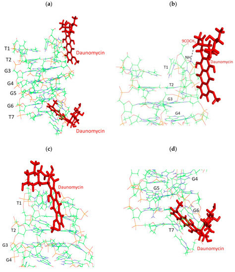 - Shen, Z.; Mulholland, K.A.; Zheng, Y.; Wu, C. Binding of anticancer drug daunomycin to a TGGGGT G-quadruplex DNA probed by all-atom molecular dynamics simulations: Additional pure groove binding mode and implications on designing more selective G-quadruplex ligands. J. Mol. Model. 2017, 23, 256. [Google Scholar] [CrossRef] [PubMed]
