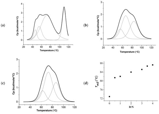 We measured the melting temperature of a folded→unfolded [d-(TTGGGGT)]4 G-quadruplex in free and bound form at D/N = 0.0, 0.5, 1.0, 2.0, 3.0, 3.5, and 4.0 independently using a differential scanning calorimeter (Figure 9a–c or Figure S8a–d). The thermogram of 50 μM of free [d-(TTGGGGT)]4 (single-strand concentration: 200 μM) fitted in a multiple-state model of deconvulation with melting transitions Tm1 = 46.2 ± 0.4 °C, Tm2 = 54.9 ± 0.7 °C, Tm3 = 72.9 ± 0.6 °C, and Tm4 = 110.5 ± 0.1 °C [39]. This in general indicates that the species may be involved in equilibria consisting of either a single-folded quadruplex to random coil transition through an intermediate, or two independent species following separate pathways not involving intermediates to the same unfolded state [48]. In the present case, the stepwise disappearance of imino protons with temperature (Figure 8) indicates the existence of several intermediates. In free DNA, G3NH and G6NH show melting around 65 °C (±5 °C), which may correspond to Tm3 = 72.9 °C, as observed in DSC experiments. G4NH and G5NH form the core of the G tetrad, and show a melting temperature well beyond 65 °C in NMR experiments, which could be referred to as Tm4 = 110.5 °C in DSC experiments (as Tm3 = 72.9 °C appears to be less probable). The observed lower melting temperatures, Tm1 = 46.2 °C and Tm2 = 54.9 °C, may correspond to the melting transitions of other regions of [d-(TTGGGGT)]4 e.g., T1/T2/T7 nucleotide residues. This may be evidenced from the imino protons of thymine not being observed, since they were in fast exchange with solvent [22], as mentioned earlier. The NH melting transitions thus give insight into the stepwise melting transitions at an atomic level, which cannot be deduced from DSC experiments. In all of the complexes at D/N = 1.0–4.0 (Figure 9b,c or Figure S8a–d, Table S5), only three melting transitions were observed; the expected fourth transition is apparently beyond the range of the temperature measurements (i.e., Tm4 > 120 °C). At D/N = 4.0, Tm1 = 60.8 ± 1.6 °C, Tm2 = 72.6 ± 0.4 °C, and Tm3 = 87.3 ± 0.5 °C, and from the comparison of DSC thermograms (Figure 9a–c or Figure S8a–d) with NH melting profiles (Figure 8), it may be inferred that Tm3 = 87.3 °C refers to the disappearance of G6NH, while the Tm4 values for G4NH and G5NH are well beyond 120 °C. Thus, the stabilization of G6NH and G4NH/G5NH are 14.4 + 1.1 °C and >10 °C, respectively. The extent of stabilization ΔTm increases with the D/N ratio (Figure 9d), which is likely to happen if both sites are not occupied at D/N = 2.0, so that binding continues as D/N approaches 4.0.