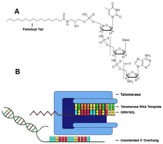 Telomerase, a ribonucleoprotein reverse transcriptase that catalyzes the addition of tandem repeats to the 3′ overhang of chromosomes, is comprised of a catalytic subunit with reverse transcriptase activity encoded by the human telomerase reverse transcriptase (hTERT) gene, a RNA template encoded by the human telomerase RNA gene (hTR), and other related proteins, such as dyskerin, NHP2, NOP10 and GAR1 [14]. One of the most promising drugs that specifically targets telomerase is the sodium salt of imetelstat (GRN163L), a synthetic lipid-conjugated 13-mer N3′→P5′ thio-phosphoramidate deoxyribo-oligonucleotide that blocks the template region of telomerase and has potential antineoplastic activity (Figure 1). The anticancer properties of GRN163L have been studied rigorously, and it is the most clinically-studied telomerase inhibitor to date [15,16,17]. GRN163L demonstrates multiple characteristics that prove beneficial in clinical applications, such as high solubility in aqueous solutions, nuclease resistance, and high stability in acidic solutions or the presence of metabolites [14,18]. GRN163L contains a palmitoyl group bound to the 5′-thio-phospate group, which confers hydrophobicity that improves uptake and retention of the drug within biological membranes, and thus enhances telomerase inhibition without the need for transfection [14]. GRN163L contains a complementary sequence to human telomerase RNA (hTR) (5′-palmitate-TAGGGTTAGACAA-NH2-3′), allowing it to antagonize a 13-mer sequence of the RNA template of telomerase near the active site, thus conferring inhibition of the enzyme. Inhibition of telomerase activity in cancer cells by GRN163L results in progressive shortening of telomeres and eventual senescence or apoptosis [14].