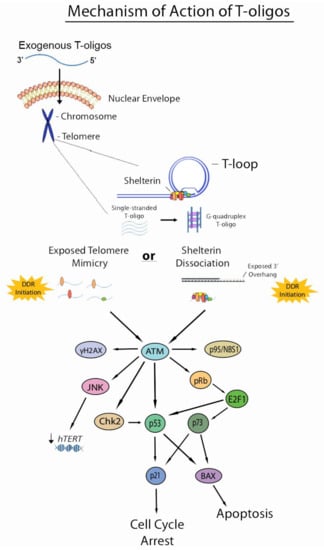 Two main models generalize the mechanism by which T-oligos induce their anticancer effects in cancer cells. These models have been summarized succinctly by Ivancich, et al. The first model has been termed the “exposed telomere mimicry model” (ETM). This model hypothesizes that once T-oligo accumulates in the nucleus of a cancer cell, DNA damage-sensing proteins detect these oligonucleotides as damaged DNA due to their homology to the telomere. These proteins then initiate DDRs that mirror those induced under typical physiological instances of DNA damage. The second model is termed the “shelterin dissociation model” (SDM) that revolves around interactions of T-oligo with shelterin proteins. In this model, once T-oligo accumulates in the nucleus of a cancer cell, it interacts with the shelterin proteins, triggering their dissociation from the telomere. These proteins then bind to T-oligo and are sequestered from the telomere, thus exposing the telomere overhang and inducing DNA damage responses [46]. Though it is quite possible that exposed telomere mimicry is partially responsible for the DDRs induced by T-oligo treatment, recent evidence suggests that shelterin dissociation is also involved in the mechanistic action of T-oligo. A recent study using melanoma cells showed an upregulation of TRF2 by 2.2- and 3.0-fold and POT1 by 3.0-fold after T-oligo treatment for 48 and 72 h, respectively, by Western blotting. Upregulation was further verified by immunofluorescence, demonstrating an upregulation of 2.4- and 2.0-fold for TRF2 and POT1, respectively. Furthermore, binding of TRF2 and POT1 to T-oligo was verified by pull-down assay, suggesting that dissociation of shelterin proteins and their subsequent binding to T-oligo is indeed involved in the mechanism of action of T-oligo [4]. However, similar studies in colorectal cancer cells showed downregulation of these proteins upon T-oligo treatment, warranting the need to investigate these effects in other cancers [7]. Shelterin proteins may be degraded in certain cancers and rapidly synthesized in others to compensate for loss of these proteins. Further studies are required to understand the interaction of T-oligo with shelterin proteins and the molecular mechanism of DDR induction by T-oligo at the level of the telomere.