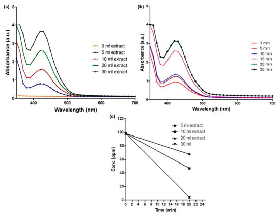 The estimated time and extract concentration required for maximum bioreduction of Ag ions into zero valent AgNPs was further confirmed using ICP. As shown in Figure 2c, 5 mL and 10 mL of the extract concentration decreased approximately 30.38% and 51.21% of Ag ions, respectively, within 20 min. However, 94% of Ag ions were reduced by 20 mL and 30 mL of extract concentrations within 20 min of reaction time. Therefore, the optimum extract concentration and time for maximum synthesis of AgNPs were estimated to be 20 mL and 20 min, respectively.