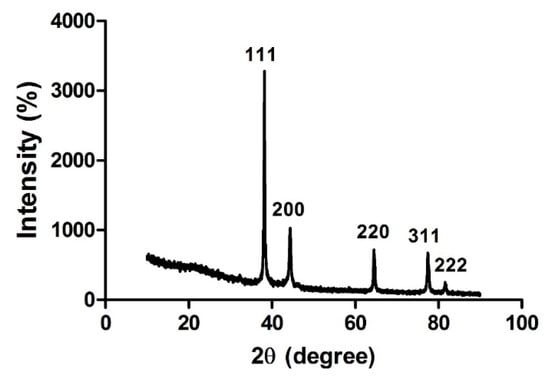 XRD study was performed to identify the crystalline structure of bAgNPs. Five intense diffraction peaks were observed at 38.14, 44.31, 64.48, 77.42, and 81.55 angles (2θ degree) which correspond to 111, 200, 220, 311, and 222 Bragg’s reflection, respectively (Figure 3). These XRD peaks can be indexed as face-centered cubic silver (fcc), demonstrating high crystalline form of bAgNPs. These XRD peaks were also used to calculate the size of crystalline bAgNPs by Scherrer’s equation.