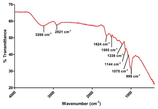 The possible interaction of bAgNPs and the phytochemicals present in Coptidis rhizome extract was determined using FTIR. These phytochemicals were presumed to act as stabilizing and reducing agents. Figure 5 shows the FTIR spectrum in the range of 400 cm−1 to 4000 cm−1 demonstrating varying peaks located at 3266 cm−1, 2921 cm−1, 1624 cm−1, 1505 cm−1, 1228 cm−1, 1144 cm−1, 1075 cm−1, and 999 cm−1.