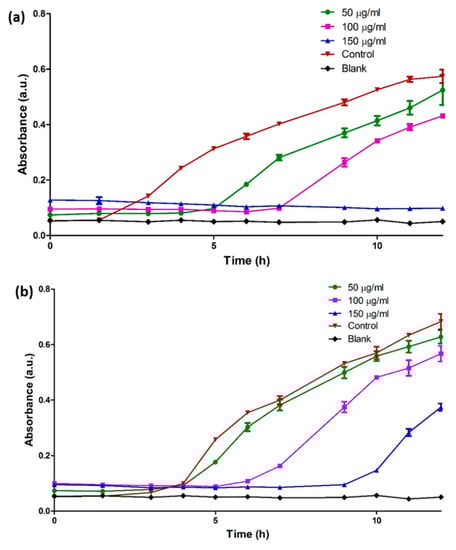 Here, turbidity measurements were used to evaluate the antimicrobial activity of bAgNPs against both Gram negative (E. coli) and Gram positive (S. aureus) microorganisms. Results showed dose dependent decrease in the bacterial growth upon treatment with bAgNPs. As compared to control, bAgNPs tend to increase the lag phase in bacterial growth curve of both the microorganisms at all the treated concentrations (50, 100, and 150 µg/mL) (Figure 6). It was observed that at high concentration (150 µg/mL), Coptidis rhizome-mediated bAgNPs completely inhibited the growth of E. coli until almost 12 h. Furthermore, the results also showed that the antimicrobial effect of bAgNPs was stronger against E. coli than to S. aureus.