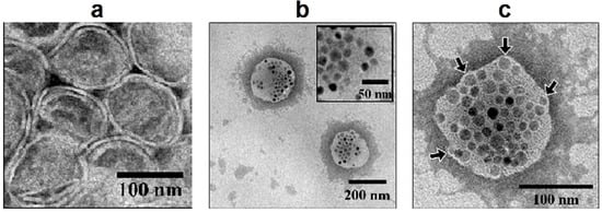 Representative TEM micrographs of (a) cisplatin-loaded liposomes (Cis-Ls) and (b,c) cisplatin-loaded magnetic liposomes (Cis-MLs). All samples were negatively stained with 2% uranyl acetate solution. The inset represents an enlarged view of the magnetite nanoparticles contained in the liposome structure.