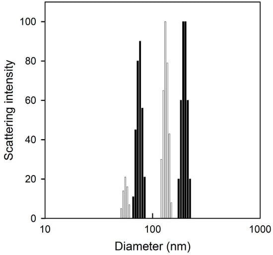 The size of the Cis-MLs observed with TEM ranged from 170 to 230 nm, while the hydrodynamic size calculated by dynamic light scattering (DLS) (Figure 2) exhibited a bimodal distribution (range from 70 to 85 and 200 to 315) with peaks at 75 and 250 nm, respectively. In the hydrodynamic size case, the size distributions directly obtained from the intensity of scattered light are biased to higher values as a result of the increase of scattering efficiency with the sixth power of particle size. When a polynomial distribution of sizes is present, the effective diameter calculated by the 90Plus Particle Size Analyzer (Brookhaven Instruments Corporation, Long Island, NY, USA) is an average diameter that is weighted by the intensity of light scattered by each particle. For this reason, the liposome size reported in Table 1 is around 100 nm. It is known that DLS gives an estimation of the hydrodynamic radius of the particle whereas TEM determines the projected area diameter. In DLS, the layer of solvent particles attached to the pegylated liposomes under the influence of Brownian motion affects the estimation of the hydrodynamic diameter. With TEM, the hydration layer is not observed (or considered), and only the projected area of the liposome’s core is used. Both values are important to report; the hydrodynamic size is used to estimate and understand the clearance behaviour of liposomes in blood circulation, while the projected diameter is used to estimate the morphology of liposomes.