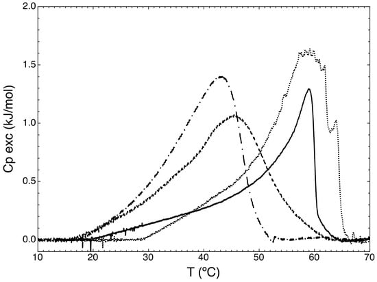 Differential scanning calorimetry (DSC) experiments were performed at 5 to 70 °C utilising a scan rate of 1 °C/min on a VP-DSC calorimeter (Microcal, Northampton, MA, USA). Prior to the scans, all solutions were degassed while being stirred under vacuum. An excess pressure of 3 atm was applied to the cells during scanning. DSC scans were performed from 5 to 70 °C at a scan rate of 1 °C/min. Water versus water scans were performed prior to the liposome scans.