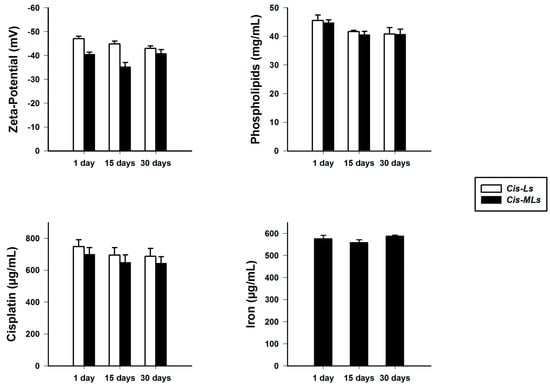The concentration of cisplatin, iron, phospholipids, and cholesterol and values of ζ-potential were measured 15 days and 1 month after preparation of the liposome suspensions. They were stored at 4 °C and protected from light.