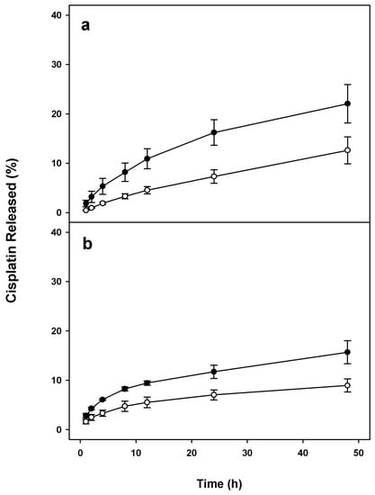 In vitro drug release profiles of cisplatin-loaded liposomes (Cis-Ls, white dots) and cisplatin-loaded magnetic liposomes (Cis-MLs, black dots). (a) Percentage of cisplatin released after 48 h of incubation at room temperature in saline solution; (b) Percentage of cisplatin released after 48 h of incubation at 37 °C in human serum. Values are expressed as the mean ± SEM (n = 3).