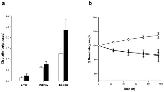 (a) Cisplatin accumulation in tissues 96 h after administration of cisplatin-loaded liposomes (Cis-Ls, white bars) or cisplatin-loaded magnetic liposomes (Cis-MLs, black bars); in both cases, the injected dose corresponds to 6 mg/kg cisplatin and 2 mg/kg iron; (b) Remaining weight versus time following the administration of Cis-Ls (white dots), Cis-MLs (black dots), and control group (animals without any treatment, open triangles). The animals were weighed before the liposome injection and every 24 h post-administration. Values are expressed as the mean ± SEM (n = 5–6).