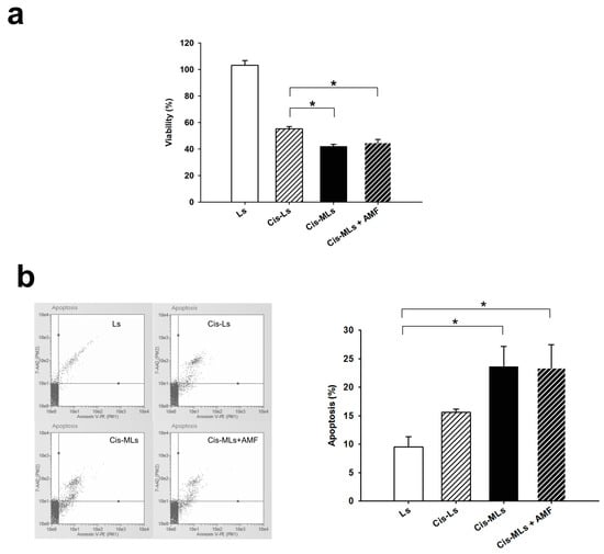 (a) Cell viability at 72 h post-treatment with liposomes only (Ls, control), cisplatin-loaded liposomes (Cis-Ls), cisplatin-loaded magnetic liposomes (Cis-MLs), and Cis-MLs plus magnetic hyperthermia treatment with an alternating current magnetic field (AMF) (Cis-MLs + AFM); (b) Percentage of apoptotic cells at 72 h after treatment with liposomes only (Ls, control), cisplatin-loaded liposomes (Cis-Ls), cisplatin-loaded magnetic liposomes (Cis-MLs), and Cis-MLs plus magnetic hyperthermia treatment (Cis-MLS + AFM). Values are expressed as the mean ± SEM of three individual experiments. (*) Indicates a significant difference (p < 0.05) between the groups.