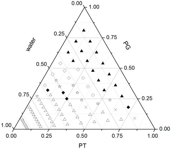 Phase behaviour of the PT-PG-water system. ▲ Isotropic solution; ♢ emulsion; ☆ emulsion + lamellar phase; ♦ lamellar phase; × lamellar + cubic phase; ∆ cubic phase.