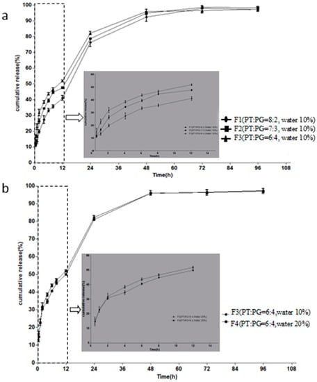 (a) Effect of PT/PG ratio on the MH (10 mg/g) release behaviour, (b) Effect of water content on the MH (10 mg/g) release behaviour. Inserted panel shows the in vitro release profiles in the first 12 h. Data are presented as mean ± SD (n = 4).