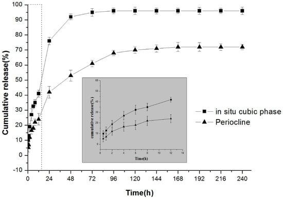 The comparison of the release behaviour of 20 mg/g MH-loaded in situ cubic liquid crystal and Periocline®. Inserted panel shows the in vitro release profiles in the first 12 h. Data are presented as mean ± SD (n = 3).