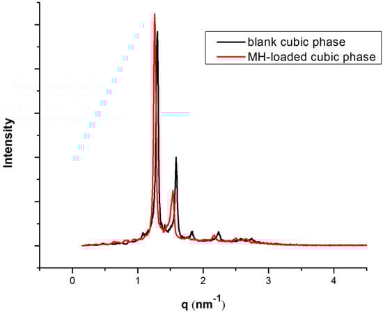 SAXS profiles of blank cubic phase and 20 mg/g MH-loaded cubic phase.