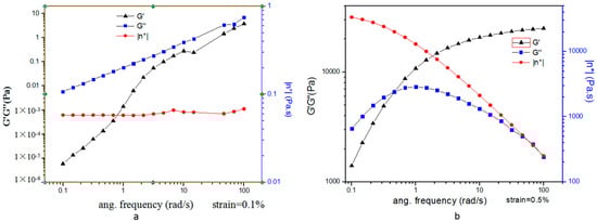 Storage, G′ and loss, G″, moduli as a function of shear frequency. (a) MH-loaded precursor formulation. (b) MH-loaded precursor formulation in excess water.