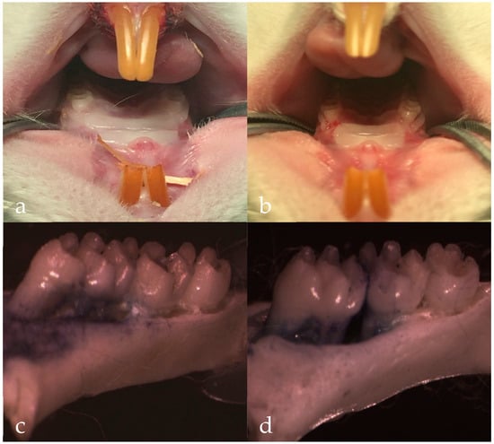 The photographs of gingival tissue: (a) normal group, (b) model group. The photographs of alveolar bone: (c) normal group, (d) model group, magnification ×12.5.