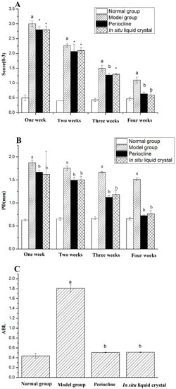 High glucose feeding [36], silk ligation of animal teeth [37] and periodontal local inoculation of suspected pathogens [38] can be all used to induce periodontitis. The latter two methods obtain the local pathological manifestations of periodontitis by locally adding periodontal stimulants. High glucose can weaken the ability of cell migration, weaken the healing ability of periodontal tissues and affect the inflammatory secretion of gingival epithelial cells. Meanwhile, the expression of Toll-like receptor 4 (TLR4) and Interleukin 6 (IL-6) in human gingival epithelial cells can be upregulated Periodontitis is a multifactor-induced disease, and the current model of periodontitis in rats often combines two or more methods in model rats, In this study, the use of silk ligation combined with high-sugar feeding method was used and after 10 weeks, the typical symptoms of periodontitis were observed, including gingival edema, gingival soft and depressed alveolar bone resorption (Figure 8). This suggested that periodontitis model was constructed successfully. After 4 weeks treatment of Periocline® and in situ cubic liquid crystal, the scores of gingival index (GI), probing depth (PD) and alveolar bone loss (ABL) of each group is graphically illustrated in Figure 9. The model group showed significant higher GI, PD, and ABL levels compared to the normal group (p < 0.01). There was significant reduction of inflammatory symptoms in Periocline® group and in situ cubic liquid crystal group compared with model group (p < 0.01). Likewise, the values of GI, PD, and ABL are all close to the normal group in the first four weeks.
