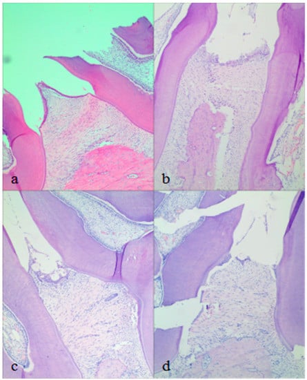 Histopathological observation: (a) normal group, (b) model group, (c) Periocline® group (after 4 weeks treatment), (d) MH-loaded in situ cubic liquid crystal group (after 4 weeks of treatment). H&E × 100.