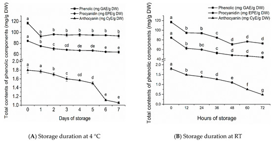 Changes of total contents of phenolic, procyanidin, and anthocyanin in litchi pericarp during storage at 4 °C (A) and at room temperature (RT) (27 ± 2 °C) (B). Values are expressed as means ± SD, n = 3. Different letters at different storage time are significantly different, p < 0.05.