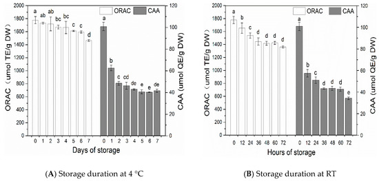 Changes of oxygen radical absorbance capacity (ORAC) and cellular antioxidant activity (CAA) antioxidant activity of litchi pericarp stored at 4 °C (A) and at RT (27 ± 2 °C) (B). Values are expressed as mean ± SD (n = 3). Bars with no letters in common are significantly different, p < 0.05.