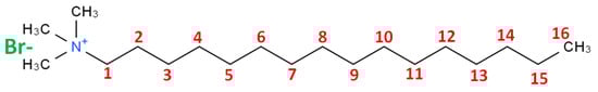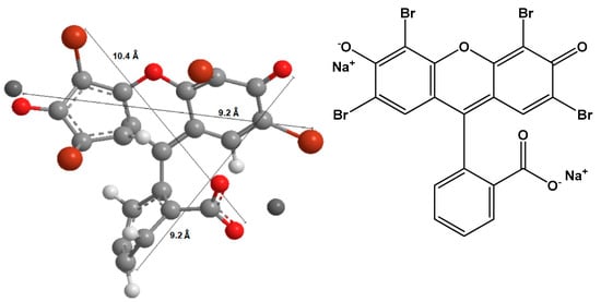 We obtained fumed silica and the salt of cetyl trimethyl ammonium bromide (C16TMABr), which is a cationic surfactant with an average molar mass of 384.44 g/mol from Sigma-Aldrich (St. Louis, MO, USA). The dye eosin Y was an analytical reagent purchased from Acros Organics (Loughborough, UK). Eosin yellow, also known as Acid Red 87, C.I. 45,380 with molecular formula C2OH6Br4Na2O5, and molecular weight equal 691.58 g/mol. All the reagents were used as received. Figure 1 presents the chemical structure of C16TMABr salt, and Figure 2 depicts the optimized three-dimensional structural formula of the eosin Y, obtained from MarvinSketch software, version 14.9.22.0 (ChemAxon, Budapest, Hungary).