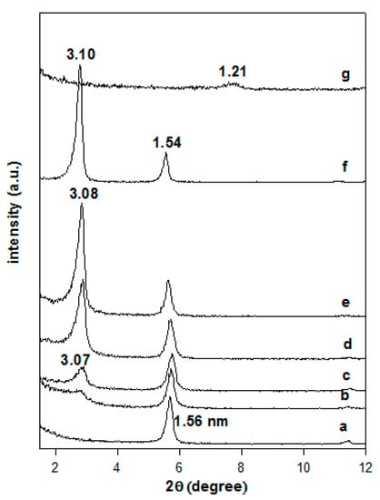 Powder XRD patterns of (a) Na-magadiite treated with different C16TMABr concentrations. (b) 0.20 mM, (c) 0.40 mM, (d) 0.80 mM, and (e) 1.20 mM, and (f) corresponds to organo-magadiite prepared from (g) H-magadiite and C16TMAOH solution.