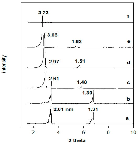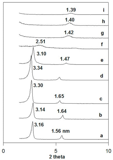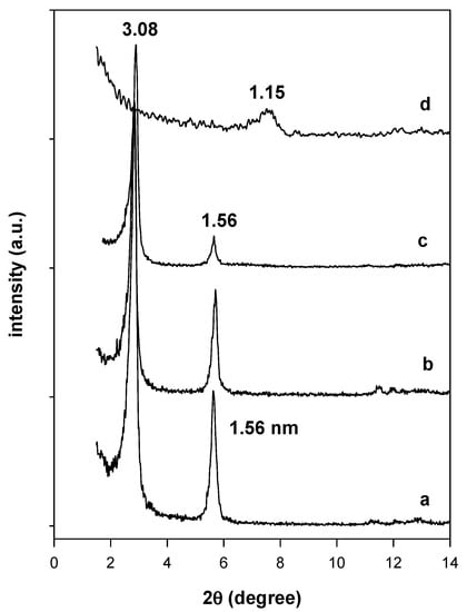 The N2 adsorption studies were performed to study the changes in the textural properties of Na-magadiite. The starting Na-magadiite exhibited an adsorption isotherm of type IV, related to a non-porous material, with the condensation of nitrogen molecules occurring at higher relative pressure values and within the voids of the magadiite particles (Figure S2). The organo-magadiites showed the same feature of the N2 isotherms with a decrease of the N2 uptake at relatively low pressure values. This decrease continued to when the magadiites were fully exchanged with C16TMA cations. The decrease in the N2-adsorbed volume indicated that the N2 molecules accessed the interlayer space; however, the intercalated C16TMA molecules occupied the active sites, which left the least active sites for N2 adsorption. In addition, the BET surface was related to the active sites on the surface, and since the C16TMA intercalation proceeded through cation exchange, the surface adsorption of the intercalated molecules would be accounted for in the SBET surface diminution [].