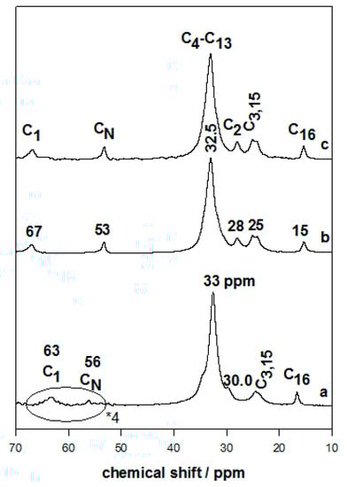 13C CP-NMR of (a) pure C16TMABr salt, and organo-magadiites exchanged with C16TMABr solution at different concentrations: (b) 0.40 mM and (c) 0.80 mM.