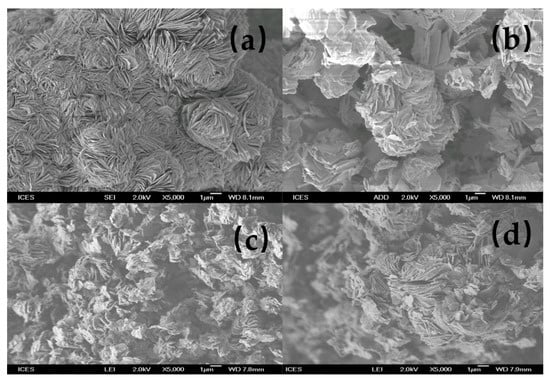 SEM micrographs of (a) Na-magadiite treated with different C16TMABr solutions: (b) 0.20 mM, (c) 0.40 mM, and (d) 0.80 mM.