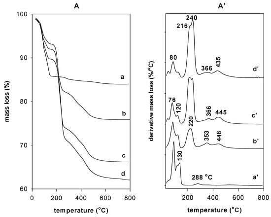 TGA (A) and DTG (A’) features of (a,a’) Na-magadiite treated with different concentrations: (b,b’) 0.40 mM, (c,c’) 0.80 mM, and (d,d’) 1.20 mM of C16TMABr solution.