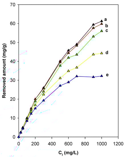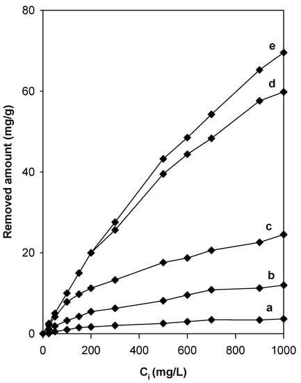 The removal of eosin was performed at different initial concentrations (Ci) for a representative sample (C16Mag-80) and at different temperatures. The maximum temperature for the removal properties was selected as 50 °C because no change in the XRD pattern of organo-magadiite was observed (see above paragraph). The data indicated that the removal efficiency at lower initial concentrations was not affected by the temperature change since 100% removal occurred at room temperature (RT) for values from 25 mg/L to 200 mg/L. This fact was due to nearly all the initial eosin being fixed by the available active sites on the adsorbent in accordance with a process that was not temperature dependent. However, at higher initial concentrations above 500 mg/L, the removal percentage and the amount removed depended on the temperature value. At 50 °C, the removal was enhanced to 85% and a maximum of amount removed of 90 mg/g was achieved for a Ci of 900 mg/L. These results were due to a higher partitioning rate of dye molecules in organophilic silicates, similar to that of organoclays and organo-kenyaites [,], or to the temperature activation of other sites (a function of the intercalated C16TMA) that started to fix eosin molecules and led to the increase of the amount removed. This fact indicated that the removal of eosin was an endothermic process [].