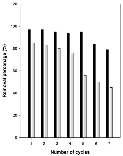 In this study, a simple method that did not require many chemicals or a large volume of water was adopted and was used in our previous studies [,]. C16Mag-120 was used as the model sample with a Ci of 500 mg/L. As shown in Figure 12, the removal efficiency of organo-magadiite was unchanged over three removal/regeneration cycles, and it varied slightly from 86% to 80%. Then, it dropped to 50% after seven cycles. The decrease in the removal efficiency could indicate that some eosin molecules were strongly adhered to the removal sites, making it difficult to remove them. However, using a low Ci value of 200 mg/L, the removal efficiency was not altered and remained unchanged for five removal/regeneration cycles. dropping to 80% after the six cycles. These data indicated that organo-magadiite could be used as a potential removal agent for eosin dye.