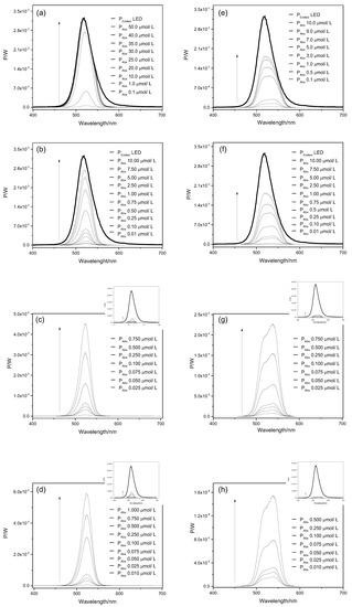 Spectra of light emitted by LED and power absorbed by ERY and RB for planktonic cells of E. coli (a,e), S. aureus (b,f), E. hirae (c,g) and L. innocua (d,h). The arrow indicates increase in photosensitizer concentration. The small chart displayed on the top-right side of figures (b,d,f,g,h) corresponds to its scaled-down graph.