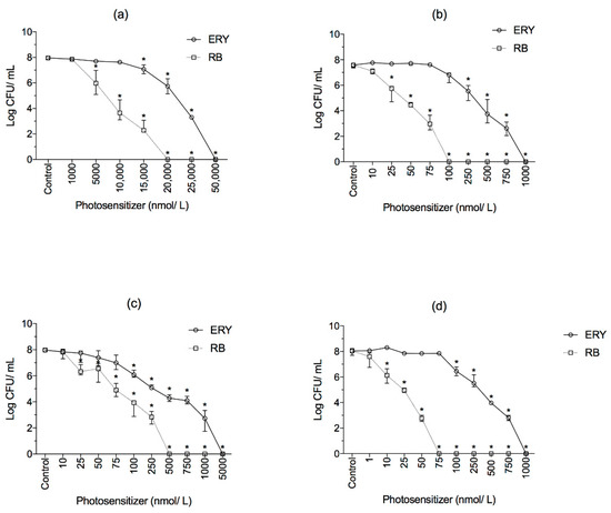 Survival of (a) E. coli, (b) S. aureus, (c) E. hirae and (d) L. innocua planktonic cells subjected to aPDI using different concentrations of ERY and RB. Cells were incubated for 10 min in the dark and then illuminated with green LED light source for 10 min. The control group represents the cells incubated only with PBS. Values are shown as medians, including 25% and 75% quantiles of at least three independent experiments. * p < 0.05 compared to the control.