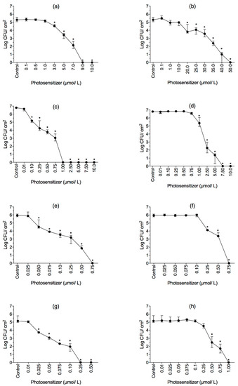 In this study, L. innocua was found to be the most susceptible bacterium to PDI among the Gram-positive ones. Low PS concentrations were able to reduce L. innocua to undetectable levels compared to the other bacteria tested. Previous studies also demonstrated that the photokilling process is strain-dependent [28], being mostly affected by the bacterial permeability to the PS [29].