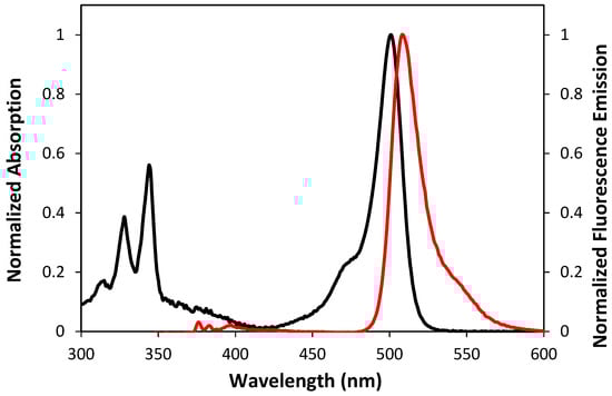 Compound 1 presented the typical absorption band of a bodipy chromophore [31,36,37]. The molar absorption coefficient for the most intense band at 501 nm was calculated to be 87,000 M−1 cm−1. Furthermore, an interesting band between 320 and 400 nm was also observed. This absorption band was due to n-π* of the free electron pair in the methoxy group [38]. We calculated the molar absorption coefficient, with a value of about 6400 M−1 cm−1 at 362 nm in THF solution.