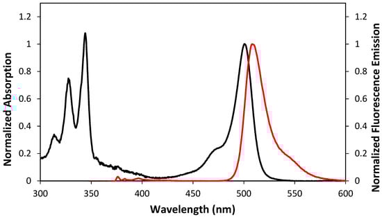 The absorption spectra of compound 4 presented the typical pyrene transition band at 344 nm due to the S0 → S2 transition [23,39] and the bodipy band at 501 nm for the S0 → S1 transition [31,35,36,40] (Figure 2). The spectra showed that the previously characterized band (320–400 nm) was preserved. We calculated the molar absorption coefficient for the two most intense bands at 344 and 501 nm (Table 1) in THF solution. Compound 7 showed higher pyrene absorption in comparison with compound 4 due to the presence of two pyrene units (Figure 3). The absorption coefficients were calculated at the same wavelengths (Table 1).