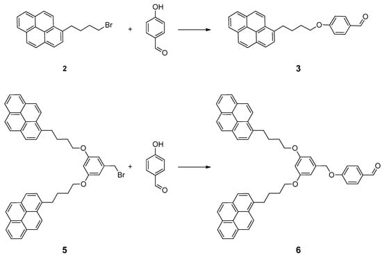 The synthesis of pyrene-labeled dendrons 3 and 6 was carried out following the classical convergent method shown in Scheme 1. The synthetic route of the bromide precursors 2 and 5 was previously reported by our research group [24]. A nucleophilic substitution of compounds 2 or 5 with p-hydroxybenzaldehyde was carried out using K2CO3 as a base and 18-crown-6 as a catalyst. After purification by column chromatography, the desired compounds 3 and 6 were obtained as white viscous solids with yields of about 80%. Proton nuclear magnetic resonance (1H NMR), carbon NMR (13C NMR), and electrospray ionization (ESI) mass spectroscopy confirmed the chemical structures of compounds 3 and 6.