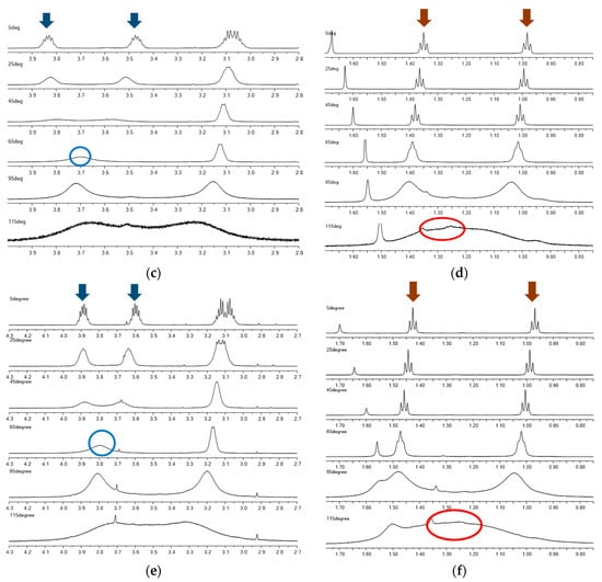 1H VT-NMR experiments on NCDEA and PCDEA. Arrows indicate each H and Me signal in each structure, and circles indicate the merged signals after the temperature increase. (a) Whole spectrum from NCDEA. Arrows indicate split H and Me signal and circles indicate the merged signal after the temperature increase. (b) Whole spectrum from PCDEA. Arrows indicate split H and Me signal and circles indicate the merged signal after the temperature increase. (c) H-H merges as temperature increases (NCDEA). (d) Me-Me merges as temperature increases (NCDEA). (e) H-H merges as temperature increases (PCDEA). (f) Me-Me merges as temperature increases (PCDEA).