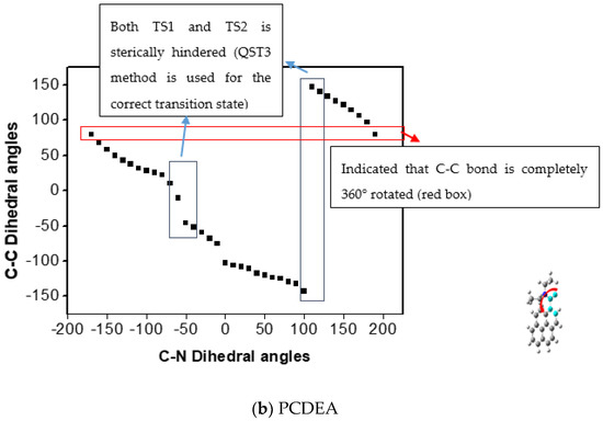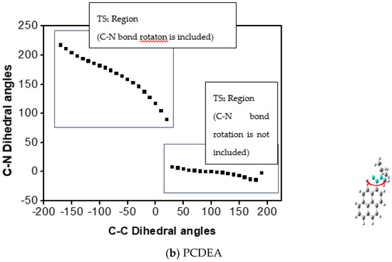 PCDEA shows a similar tendency in aryl-CO and C-N bond rotation to that of NCDEA. It is clear that the value estimated by di-ethyl rotation is similar to the experimental value. The importance of applying the dihedral angle change is thus confirmed; the value of the Gibbs free energy for QST3 optimization is 13.52 kcal∙mol−1 and can be increased by di-ethyl rotation to 14.37 and 15.74 kcal∙mol−1, values that are only approximately 1 kcal lower than or the same as, respectively, the experimental values (Table S4).