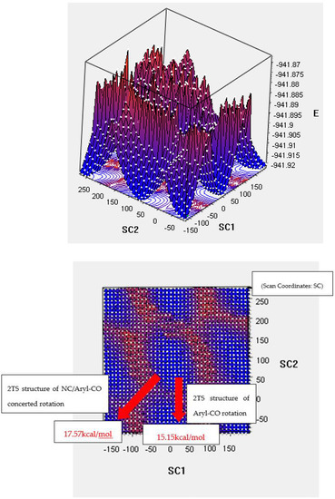 Before the transition states were obtained through quadratic synchronous transit 3 (QST3) [18], we obtained the change in dihedral angle of the aryl-CO bond as the dihedral angle of the C-N bond increased, or vice versa, by 1D PES analysis. As indicated in Figure 3 and Figure 4, whereas aryl-CO bond rotation is independent of C-N rotation, C-N bond rotation has an influence on aryl-CO bond rotation in that it experiences concerted rotation with the aryl-CO bond, consistent with previous NMR and calculation results.
