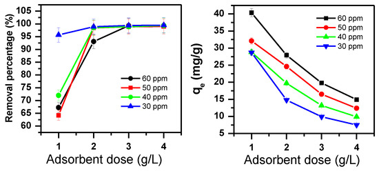 The adsorbent dose is a very important parameter in the adsorption process [70]. The removal of MB using α-MoO3 was investigated by varying the adsorbent dose from 1.0 to 4.0 g/L and the initial dye concentrations from 30 to 60 ppm (Figure 2).
