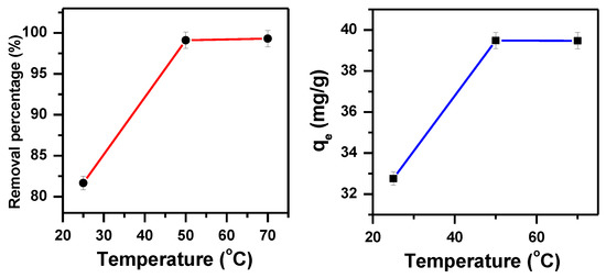 As the temperature has a great effect on removing dyes [71], an investigation was carried out on temperature as a parameter on its own from 25 to 70 °C during the process of removing the MB dye, this can be seen in Figure 3. The percentage removal of MB (at Ci = 40 ppm) has gone up from 82% to 99% and the removal capacity has increased from 33 mg/g to 39 mg/g. In actual fact, the removal activity of the adsorbent sites enhanced as the temperature increased giving rise to the dye molecule motion [71,72].