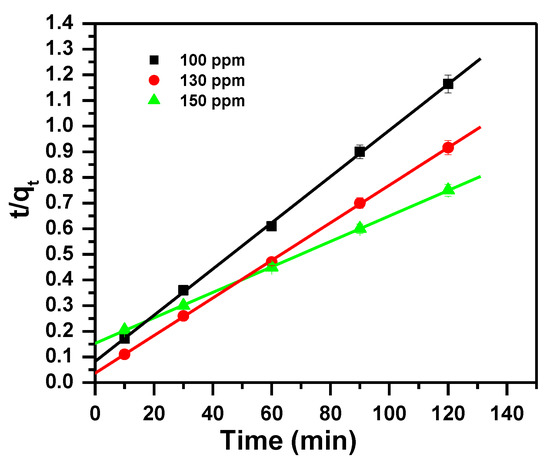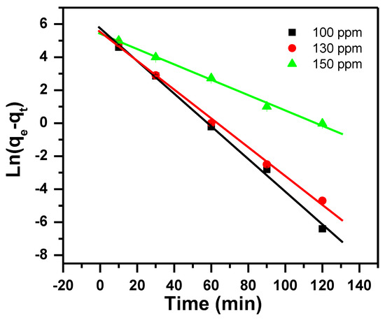 The kinetic models based on the removal capacity were fitted to experimental data to determine the rates of adsorption for MB dye molecules and to investigate the mechanism of the removal process [78].
