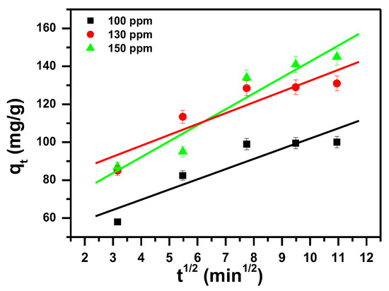 Intra-particle diffusion model plot showing the effect of contact time and initial dye concentration of MB removal by α-MoO3.