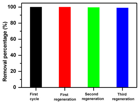 The regeneration and repeatability of the adsorbent are very critical for the practical application. Many regeneration procedures were proposed in the literature survey, including thermal treatment, chemical extraction, bio-regeneration, supercritical regeneration, microwave irradiation and so forth. Thermal regeneration is often applied for regeneration of exhausted activated carbon [91]. In our case, the structure of α-MoO3 removal agent was stable and the thermal treatment method was selected in this part.