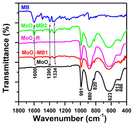 Fourier transform infrared (FTIR) spectra of MoO3, MoO3-MB1, MoO3-R, MoO3-MB2 and MB.